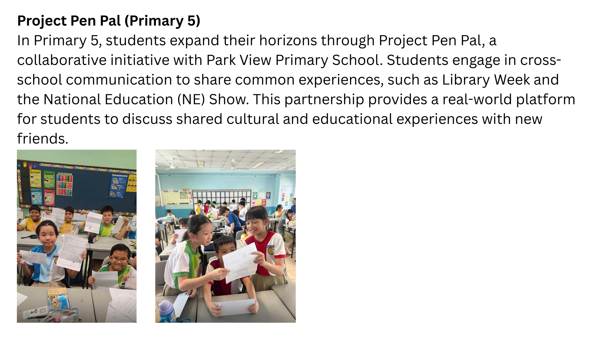 – Pen pal programme with Park View Primary School