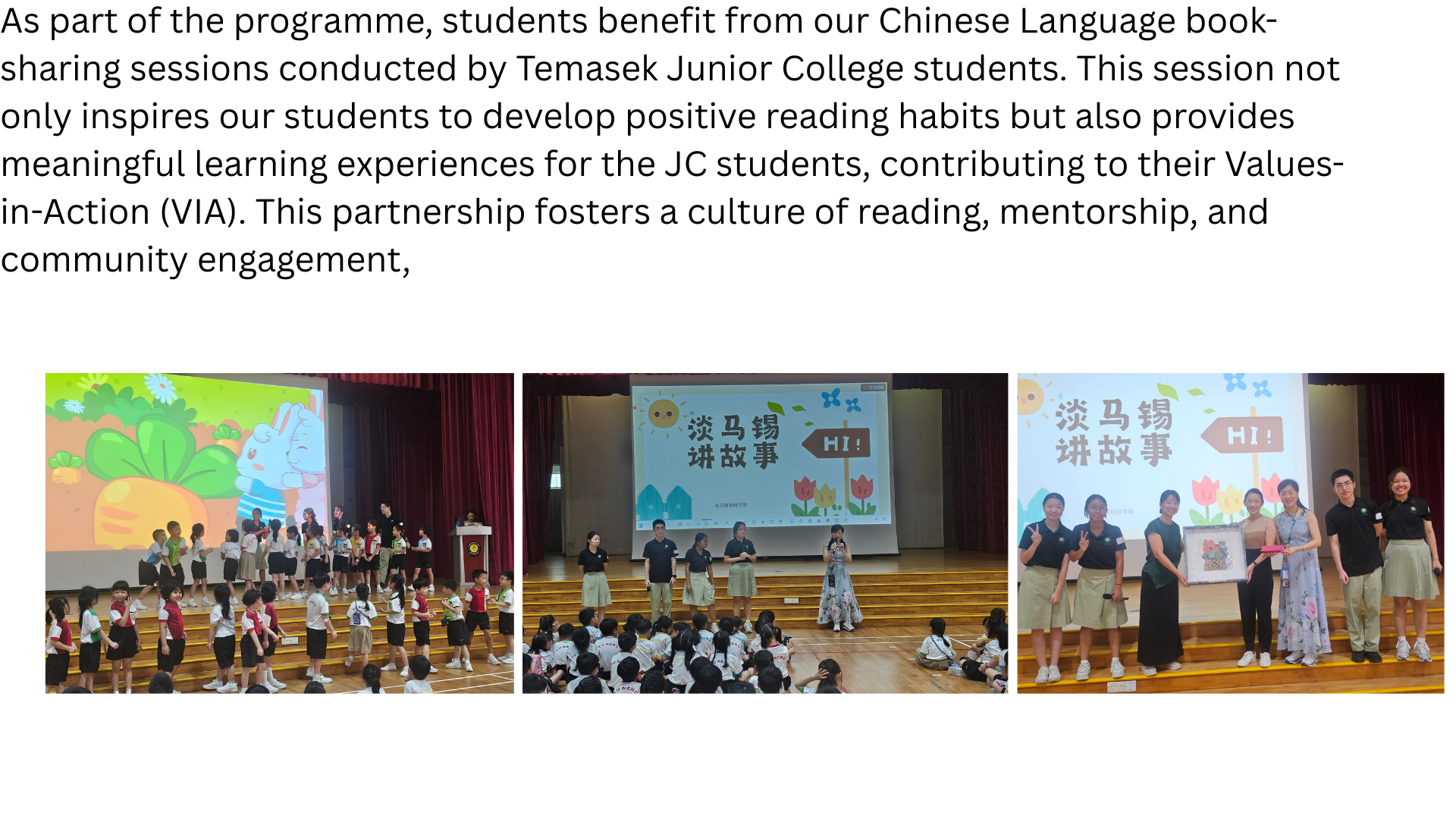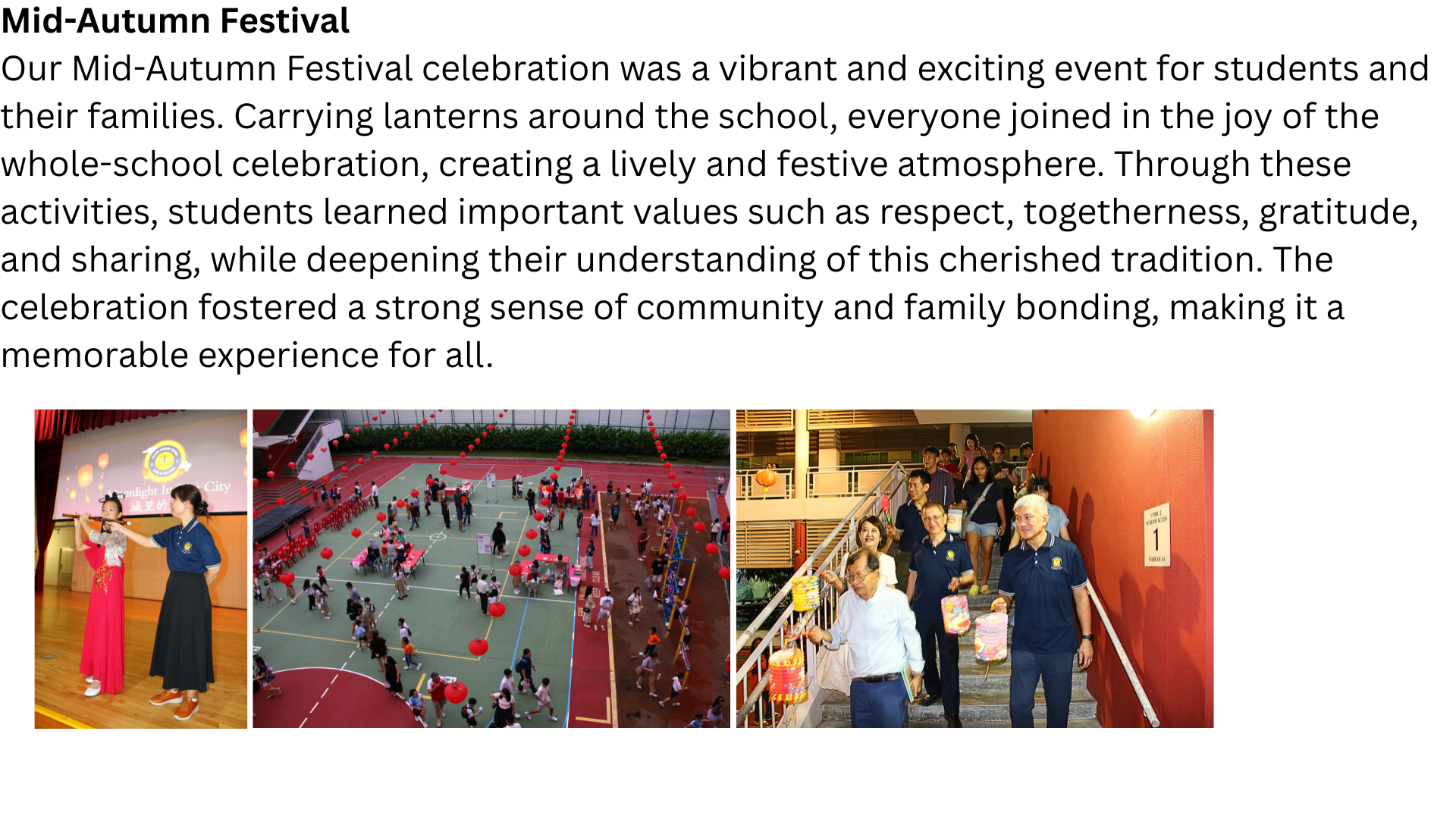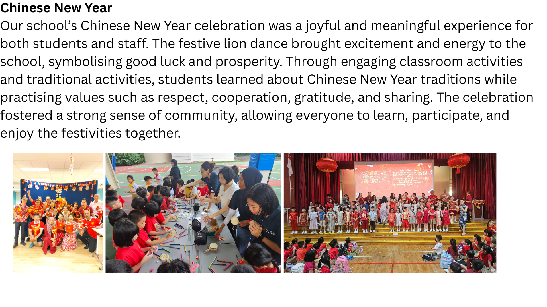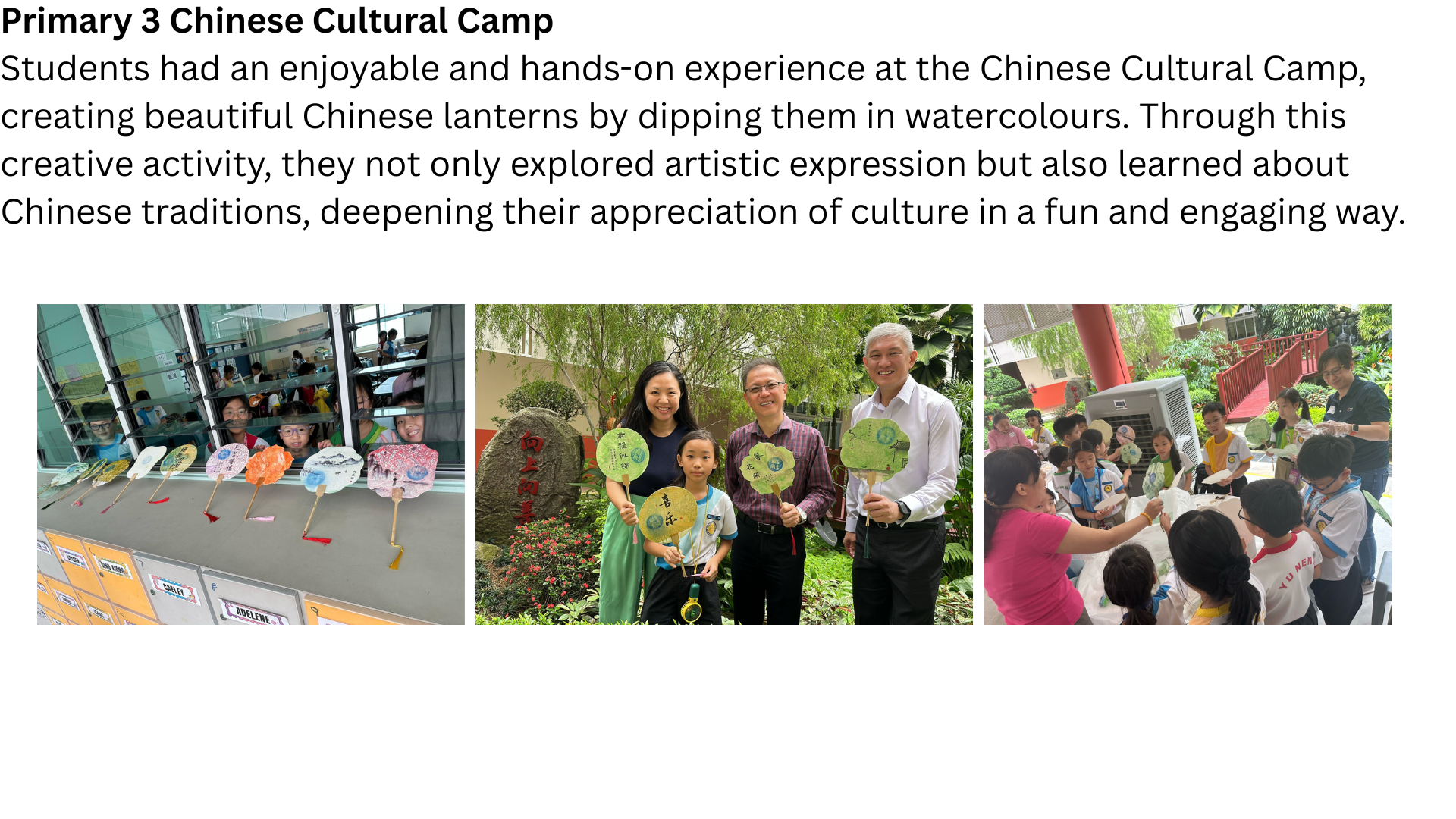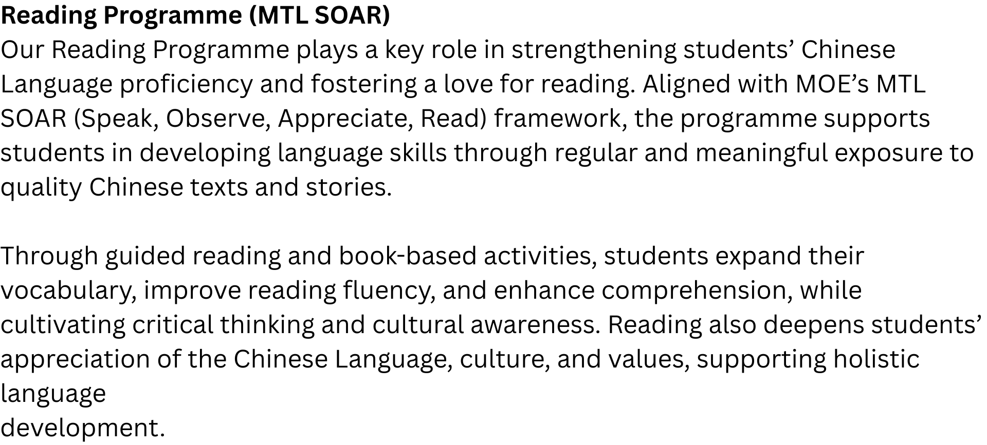 Our Mother Tongue Languages programme offers a rich and engaging range of activities designed to develop language proficiency while nurturing cultural understanding and 21st-century competencies. Students participate in a variety of language-focused activities, including Library Week, MTL SOAR (Reading programme), and language competitions, to strengthen their literacy, communication, and creative thinking skills. Beyond the classroom, students immerse themselves in cultural and festival celebrations, such as Chinese New Year, Mid-Autumn Festival, and Chinese Cultural Camp, where they engage in traditional activities like lion dances, lantern-making with watercolours, etc during these festivities. These experiences make learning vibrant and interactive, fostering values such as respect, collaboration, gratitude, and a sense of community. Special learning spaces such as the Multilingual Hub further enhance learning, providing visual and exploratory environments where students can connect with their Mother Tongue Language, culture, and values in meaningful and interactive ways. Through these programmes, our Mother Tongue Languages curriculum nurtures future-ready, confident, and culturally grounded learners who are proficient in language and deeply appreciative of their heritage.