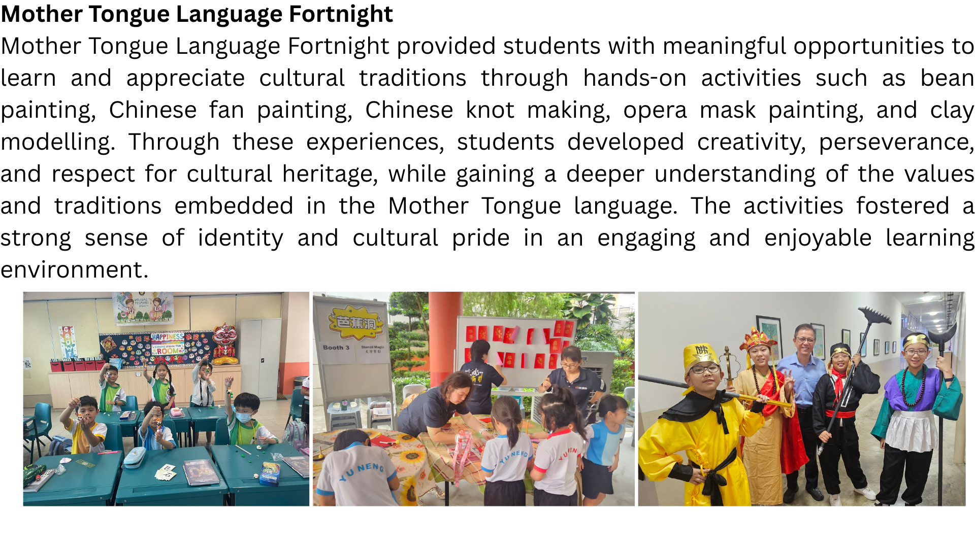 Through this balanced and inclusive approach, Yu Neng’s Mother Tongue Languages curriculum aims to nurture confident and future-ready bilingual learners grounded in language, culture, values and innovation.