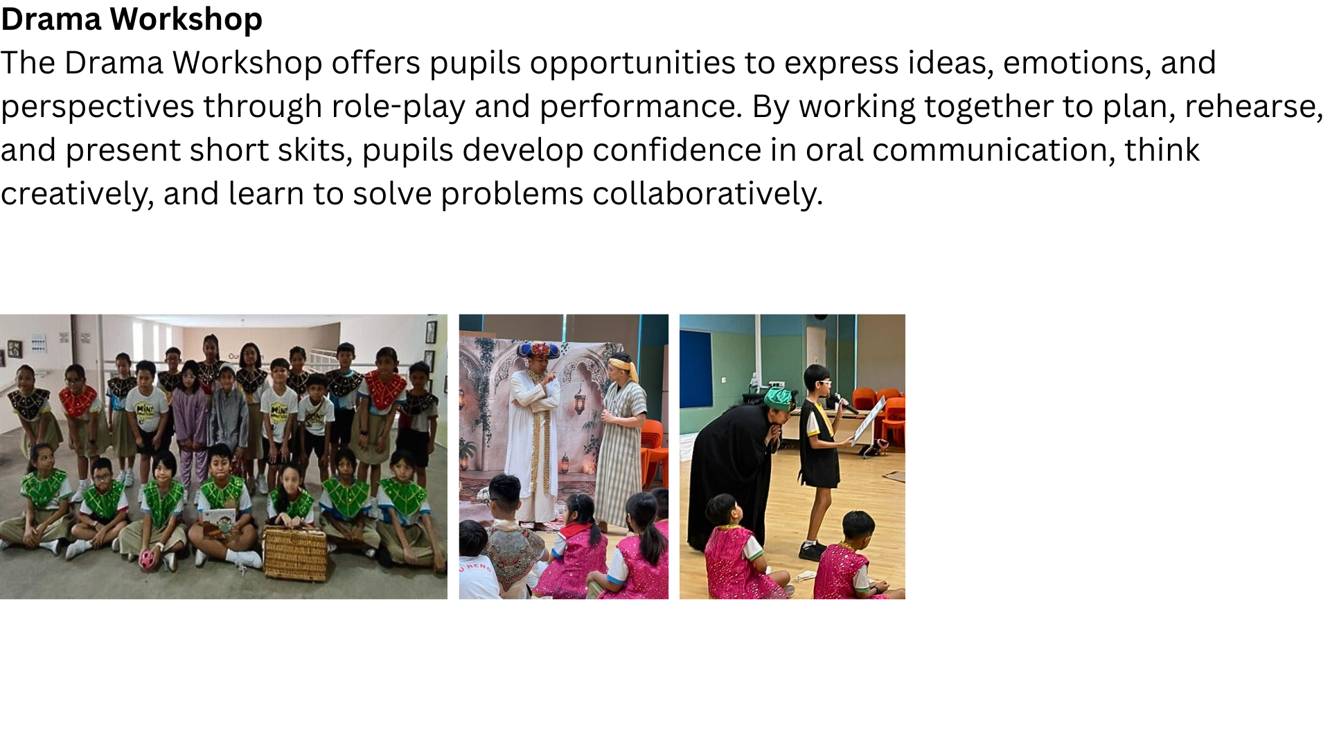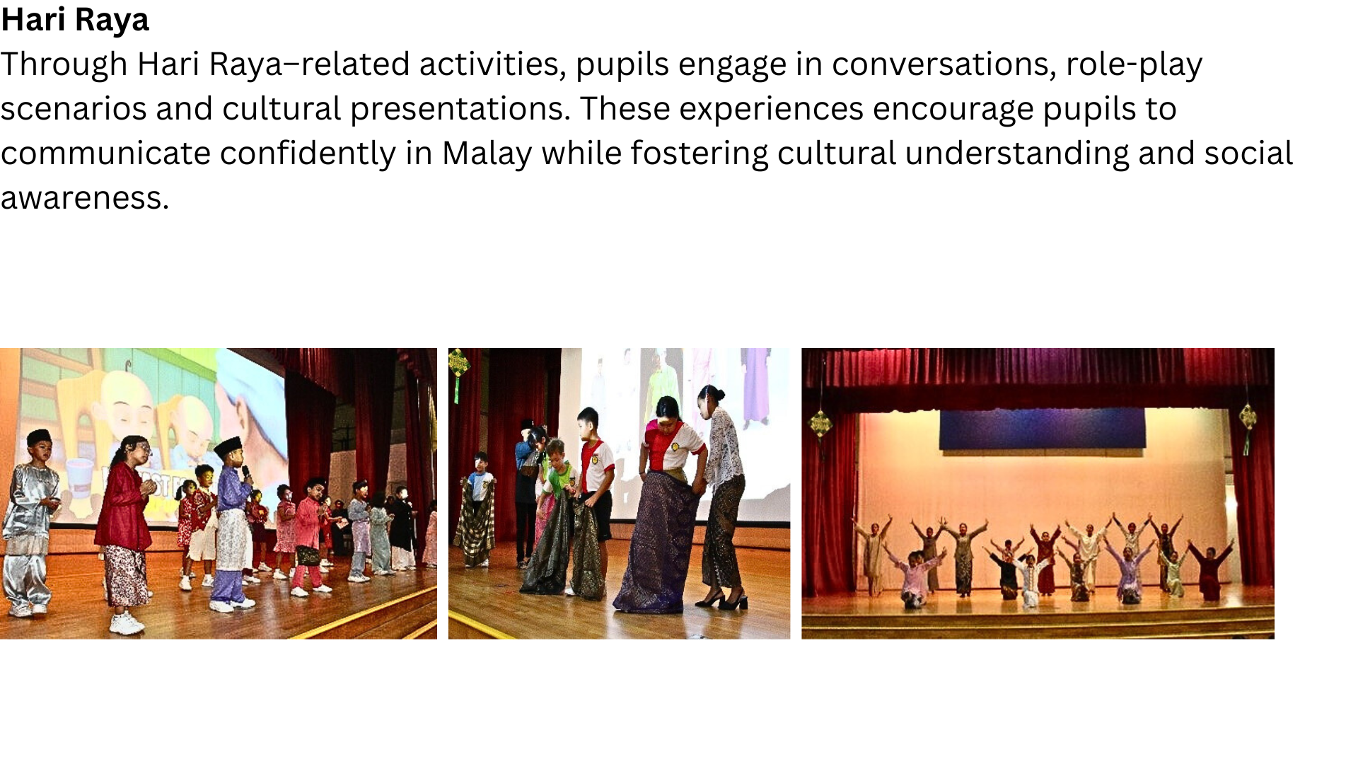 Malay Language learning beyond the classroom provides pupils with meaningful opportunities to apply language skills through cultural celebrations, interactive programmes, and drama-based learning. Activities such as Hari Raya celebrations, Mother Tongue Fortnight, and Drama Workshops nurture pupils to be confident communicators, creative thinkers, and effective problem solvers.