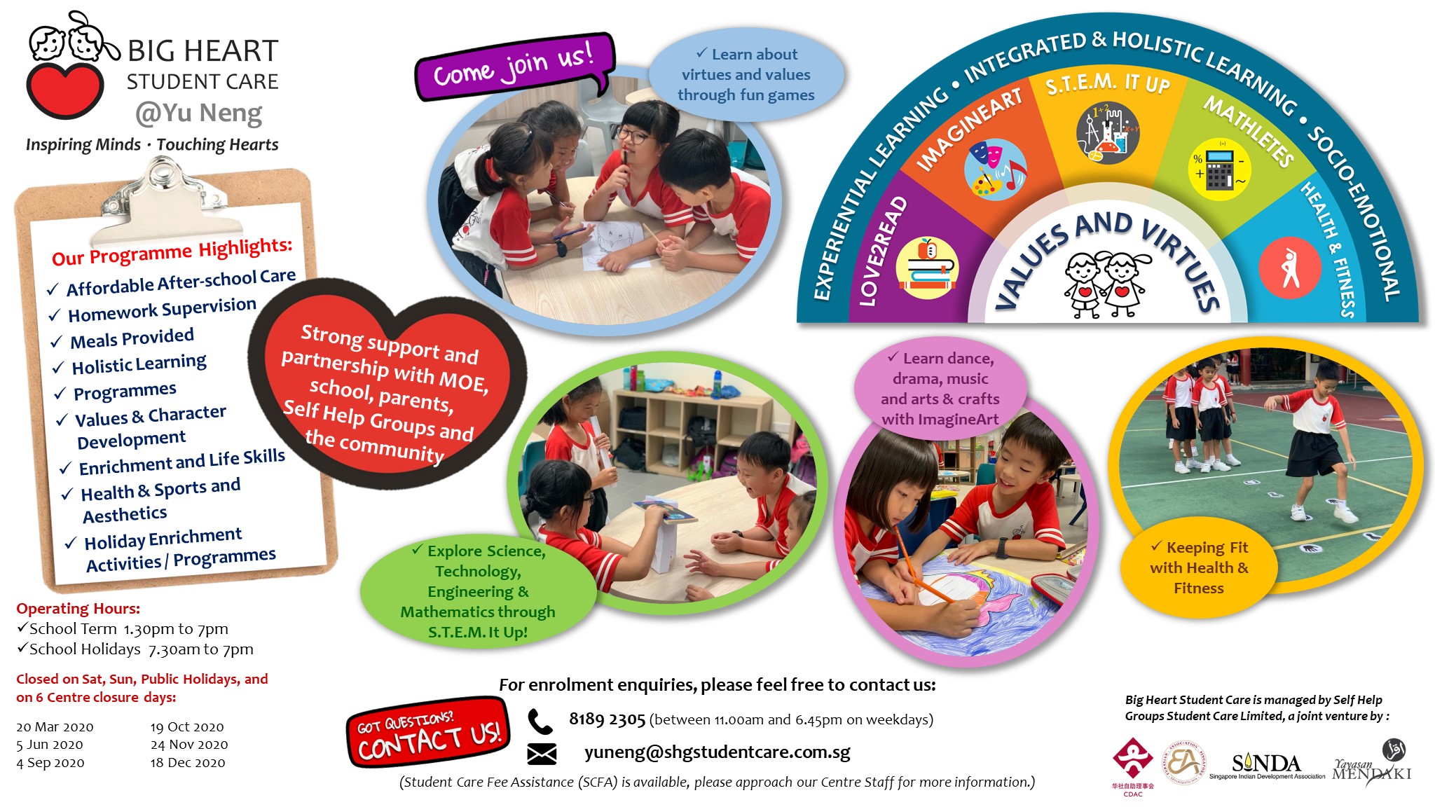 | STUDENT CARE | Big Heart Student Care Operating Hours: Mon – Fri: 10 am – 7 pm Contact number: 8189 2305 Email address: yuneng@shgstudentcarecentre.com.sg ![]() Click on the image to enlarge. |